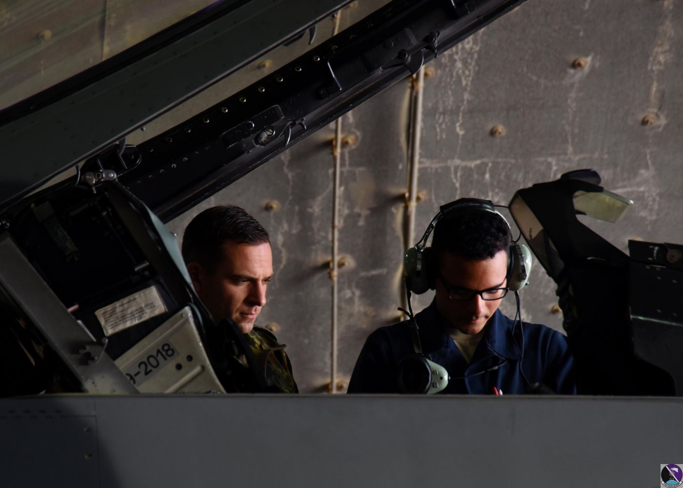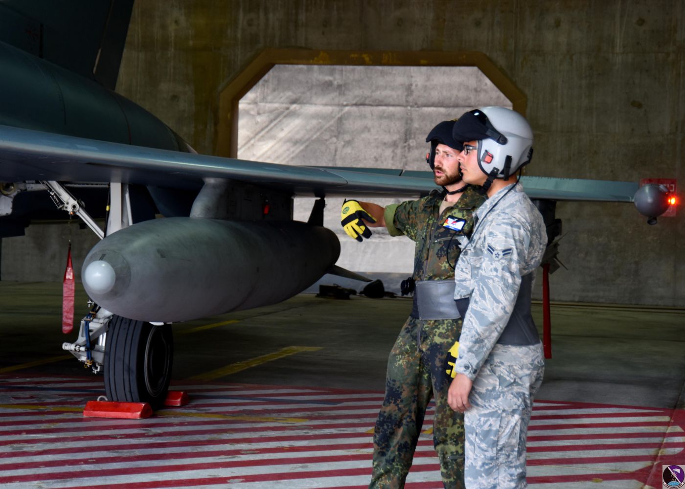 • A German air force crew chief, left, watches as U.S. Air Force Airman 1st Class Noah Luis Rivera, right, 31st Aircraft Maintenance Squadron crew chief, prepares a F-16C Fighting Falcon assigned to the 510th Fighter Squadron, Aviano Air Base, Italy, to launch at Uvda Air Force Base, Israel, Nov. 7, in support of Blue Flag 17. This biennial exercise is essential to building and maintaining defensive interoperability. (U.S. Air Force photo/Senior Airman Abby L. Finkel)