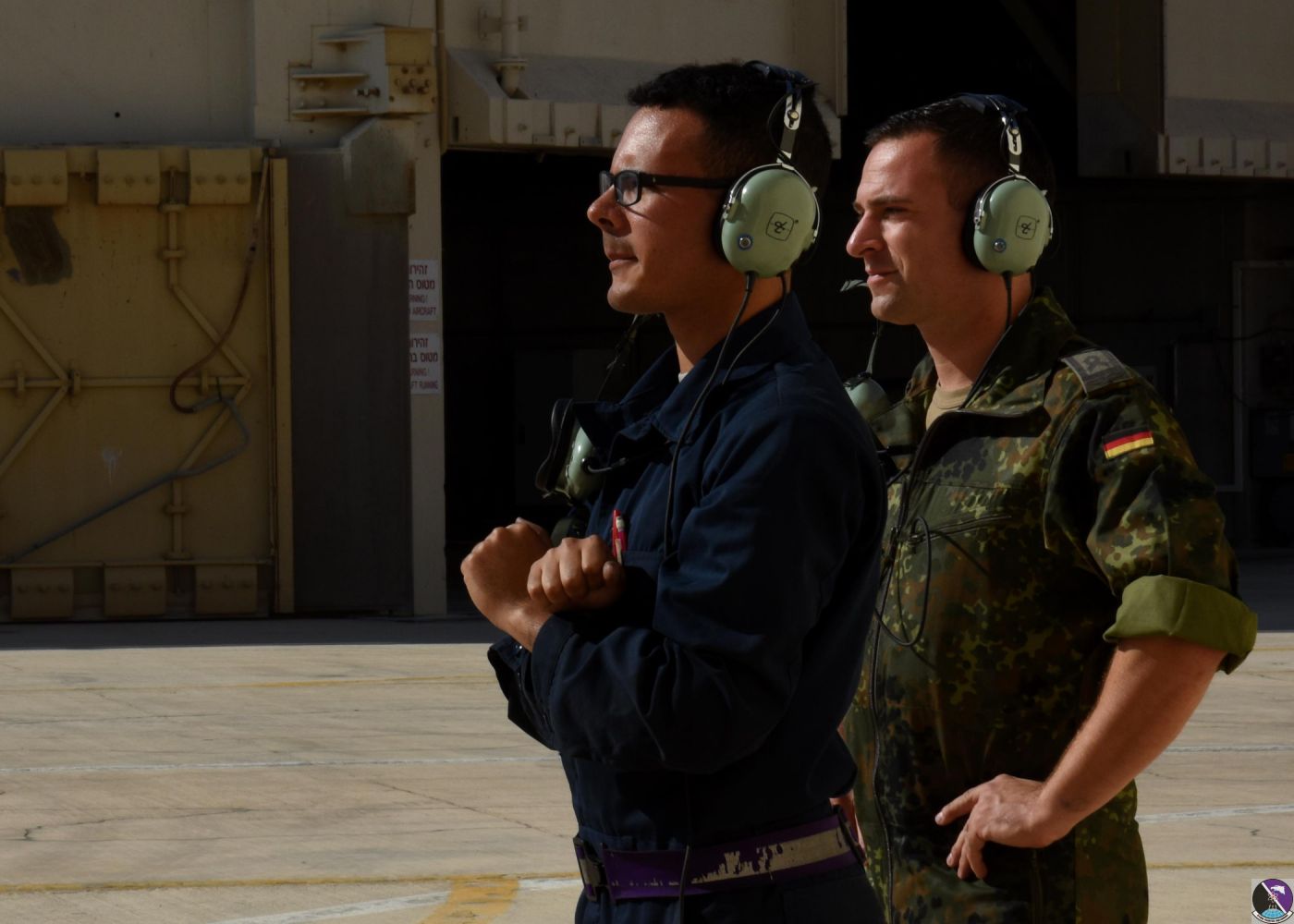 • U.S. Air Force Airman 1st Class Noah Luis Rivera, right, 31st Aircraft Maintenance Squadron crew chief, shadows a German air force crew chief at Uvda Air Force Base, Israel, Nov. 8, during Blue Flag 17. Throughout the exercise, participating nations work together in developing the interoperability necessary for maintaining and improving Israel's defensive capacity against external threats. (U.S. Air Force photo/Senior Airman Abby L. Finkel)