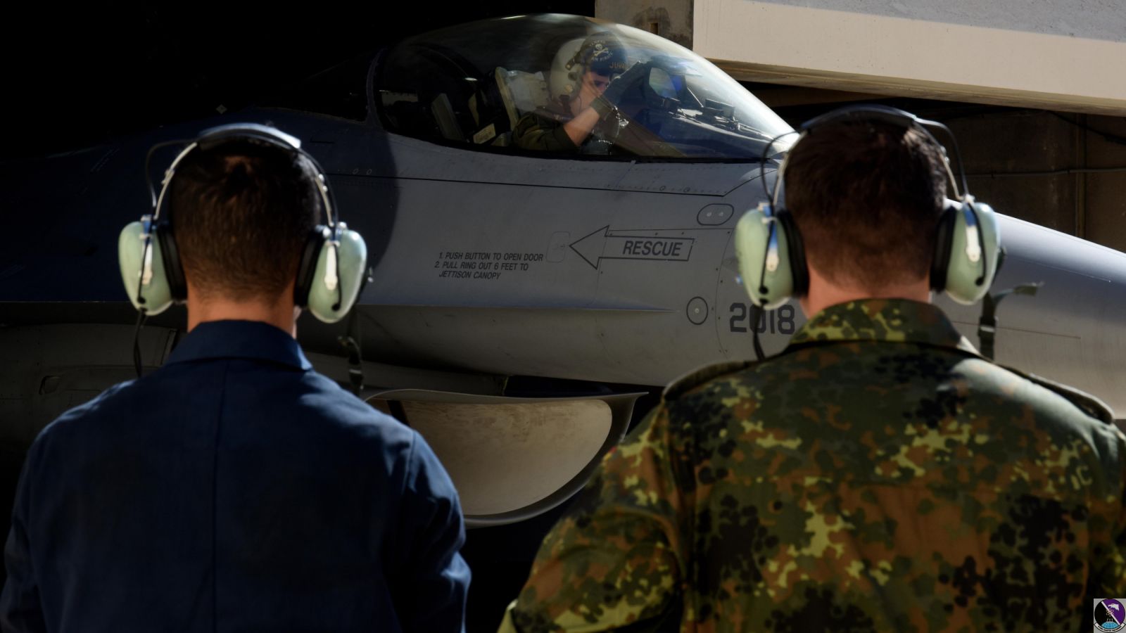 • A German air force crew chief, right, shadows U.S. Air Force Airman 1st Class Noah Luis Rivera, left, 31st Aircraft Maintenance Squadron crew chief, as he marshals a F-16C Fighting Falcon assigned to the 510th Fighter Squadron, Aviano Air Base, Italy, during Blue Flag 17 at Uvda Air Force Base, Israel, Nov. 7. Participation in exercises like Blue Flag further strengthen the relationship between the U.S. Air Force and partner nations and promote regional peace and stability. (U.S. Air Force photo/Senior Airman Abby L. Finkel)