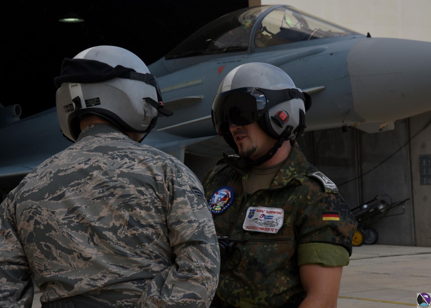• U.S. Air Force Senior Airman Cody Linholm, left, 510th Aircraft Maintenance Unit crew chief, speaks with a German air force crew chief as they prepare a German Eurofighter Typhoon for a day of flying at Uvda Air Force Base, Israel, Nov. 8, during Blue Flag 17. The U.S. Air Force's participation in Blue Flag 17 demonstrates our nation's commitment to collective defense and improves cooperation, integration and tactical effectiveness. (U.S. Air Force photo/Senior Airman Abby L. Finkel)