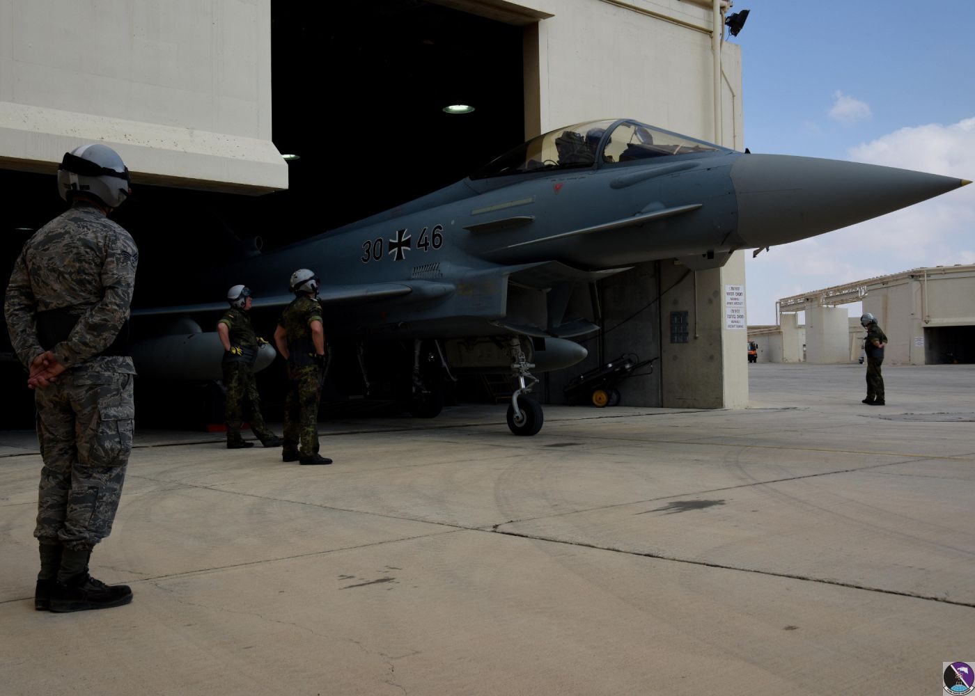 • U.S. Air Force Senior Airman Cody Linholm, left, 510th Aircraft Maintenance Unit crew chief, watches two German air force crew chiefs prepare a German Eurofighter Typhoon for a morning sortie at Uvda Air Force Base, Israel, Nov. 8, during Blue Flag 17. The goal of Blue Flag is to exercise military partnerships and strategic cooperation. (U.S. Air Force photo/Senior Airman Abby L. Finkel)